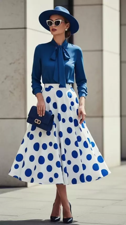 Look elegante feminino com saia branca de poá azul e blusa azul com gravatinha no pescoço. Uma produção chique, moderna e refinada. Óculos escuros estilo gatinha e salto alto completam o visual de mulher poderosa. #LookElegante #ModaFeminina #LookChique #ModaEstilosa #modafamilia