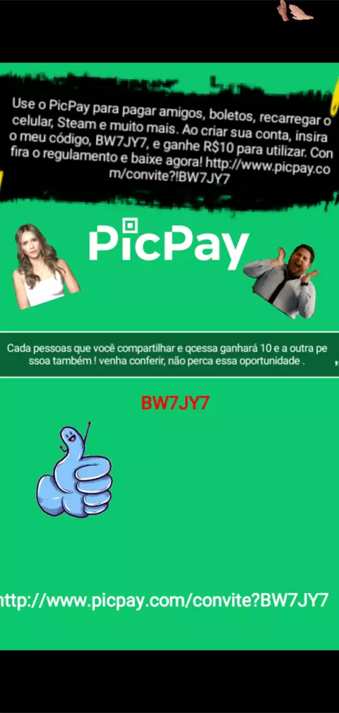 Use o PicPay para pagar amigos, boletos, recarregar o celular, Steam e muito mais. Ao criar sua conta, insira o meu código, BW7JY7, e ganhe R$10 para utilizar. Confira o regulamento e baixe agora! http://www.picpay.com/convite?!BW7JY7