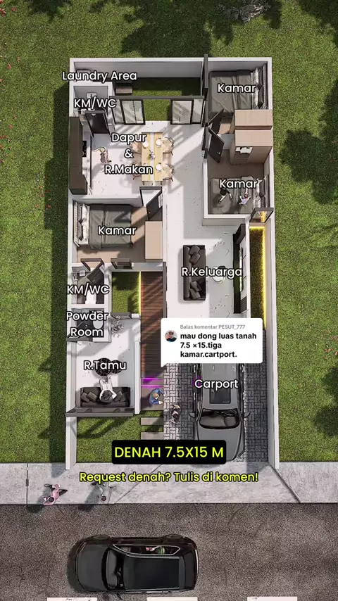 Membalas @PESUT_777 Denah Rumah 7.5x15 M Kebutuhan Ruang: Lantai 1 βœ” Carport βœ” Ruang Tamu βœ” Ruang Keluarga βœ” Dapur & Ruang Makan βœ” 3 Kamar Tidur βœ” 2 KM/WC βœ” Powder Room βœ” Laundry Area Keunggulan Desain: βœ… Layout efisien, setiap ruang dimanfaatkan dengan optimal. βœ… Sirkulasi udara dan cahaya alami. Kunjungi juga akun kami yg lain: /: kakibangun.id Custom desain? Konsultasi GRATIS via: Whatsapp: 081-33333-5195 Email: kakibangun.id@gmail.com πŸ“ Layanan: Semarang & seluruh Indonesia #...