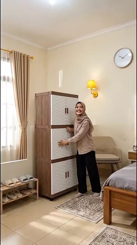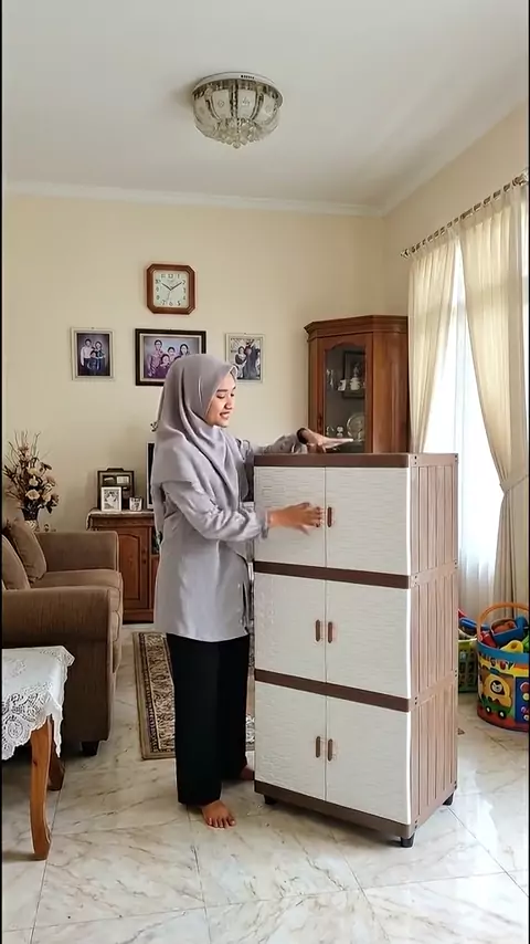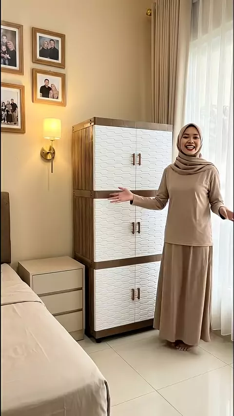 caption: Lemari plastik susun 3 pintu dengan motif putih dan aksen cokelat kayu yang ramping dan hemat ruang, cocok untuk menyimpan pakaian atau perlengkapan kamar agar tetap tertata rapi. hashtags: "#lemariplastik #lemarisusun #lemaribaju #perabotrumah #kamarrapi #penyimpananrumah #rumahminimalis #furniturrumah"