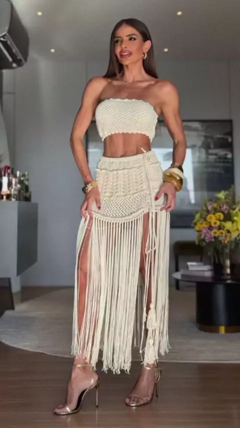Conjunto feminino CONJUNTO OURO cropped tomara que caia de Crochê com saia curta de franjas modelo o corpo empina bumbum ano novo Reveillon basico fest.