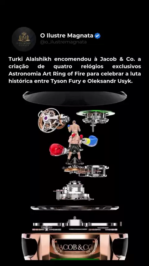 Turki Alalshikh encomendou à Jacob & Co. a criação de quatro relógios exclusivos Astronomia Art Ring of Fire para celebrar a luta histórica entre Tyson Fury e Oleksandr Usyk, marcada para 18 de maio de 2024, em Riad.
