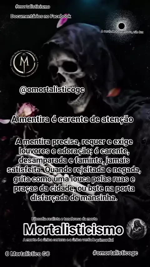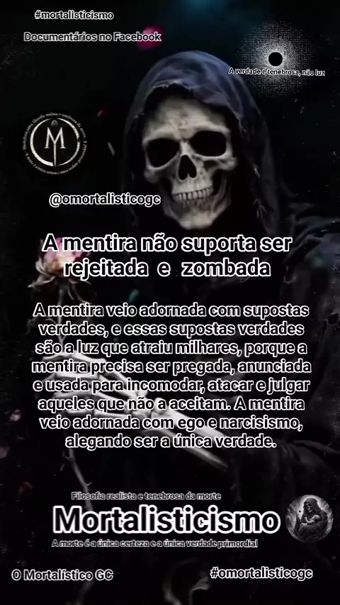 O mortalisticismo apresenta uma crítica contundente à mentira, descrevendo-a como uma força que busca se impor e se fazer respeitar a qualquer custo. A mentira é retratada como algo que precisa ser "pregada, anunciada, tratada como sagrada, como santa, como verdade única", o que sugere que ela se apresenta como uma verdade absoluta e inquestionável. A descrição da mentira como "arrogante" e que "se exibe, grita, impõe" indica que ela é uma força agressiva e dominadora, que não aceita oposição
