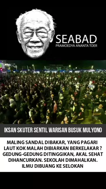 IKSAN SKUTER SENTIL WARISAN BUSUK MULYONO DALAM KONSER SEABAD PRAMOEDYA ANANTA TOER: Maling sandal dibakar, yang pagari laut malah dibiarkan berkelakar? Gedung gedung ditinggikan, akal sehat dihancurkan. Sekolah dimahalkan, Ilmu dibuang ke selokan.
