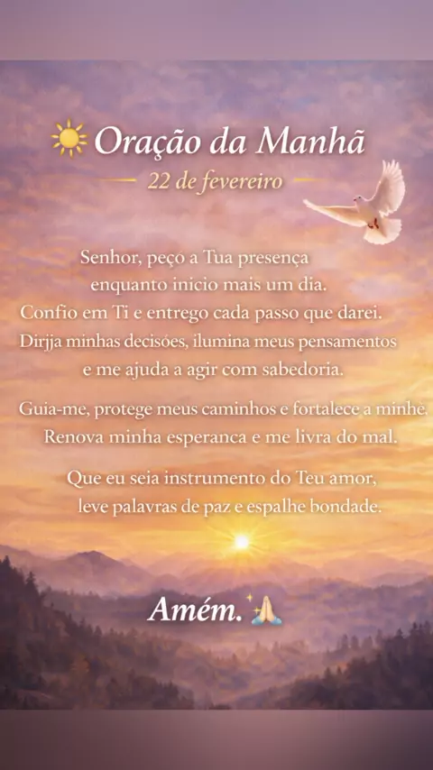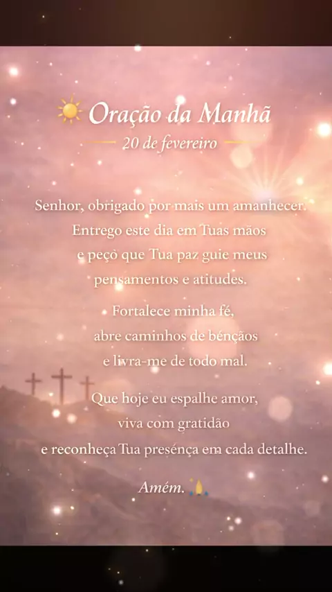 Comece o dia entregando tudo nas mãos de Deus e permita que a paz dEle guie cada passo seu. ☀️🙏 💬 Comente “Amém” e declare um 20 de fevereiro abençoado sobre sua vida. #oraçãodamanhã #fé #bomdia #gratidão #deusnocomando