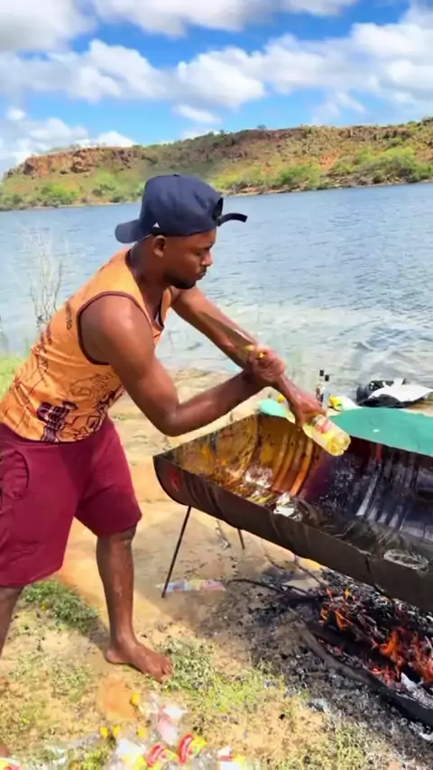 fritando peixe pirarucu gigante