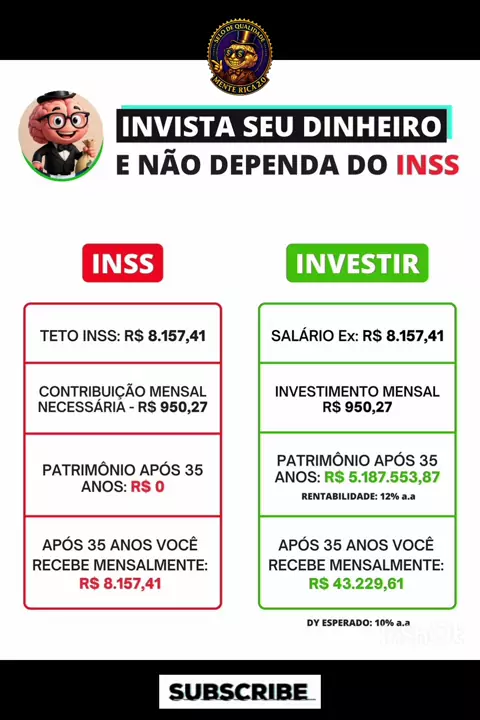 O SEGREDO QUE O INSS NÃO TE CONTA: R$ 5 MILHÕES OU PATRIMÔNIO ZERO? 🧠💰 Descrição: Você já parou para calcular quanto custa a sua "segurança"? 🧐 Neste vídeo, o Mentinha mostra a realidade nua e crua: enquanto você contribui décadas para o INSS para não acumular NADA de patrimônio, o mesmo valor investido com inteligência poderia te transformar em um multimilionário com uma renda mensal de mais de R$ 43 mil! 🚀 #INSS #Aposentadoria #LiberdadeFinanceira #JurosCompostos #Investimentos