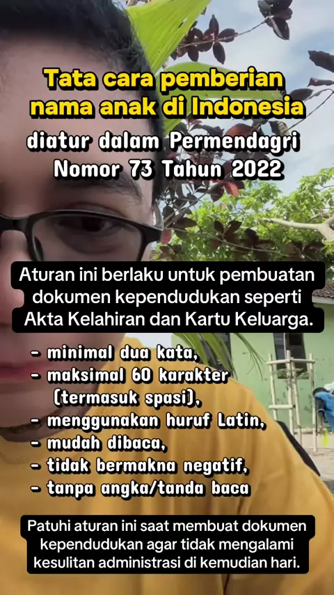 Berikut adalah poin-poin penting tata cara pemberian nama anak sesuai aturan pemerintah: Minimal Dua Kata: Nama anak tidak boleh hanya satu kata, melainkan minimal terdiri dari dua kata atau lebih. Maksimal 60 Karakter: Panjang nama, termasuk spasi, tidak boleh lebih dari 60 karakter. Huruf Latin & Bahasa Indonesia: Wajib menggunakan huruf alfabet latin (A-Z) sesuai kaidah bahasa Indonesia. Dilarang Tanda Baca & Angka: Nama tidak boleh mengandung angka atau simbol/tanda baca (contoh: koma, peti...
