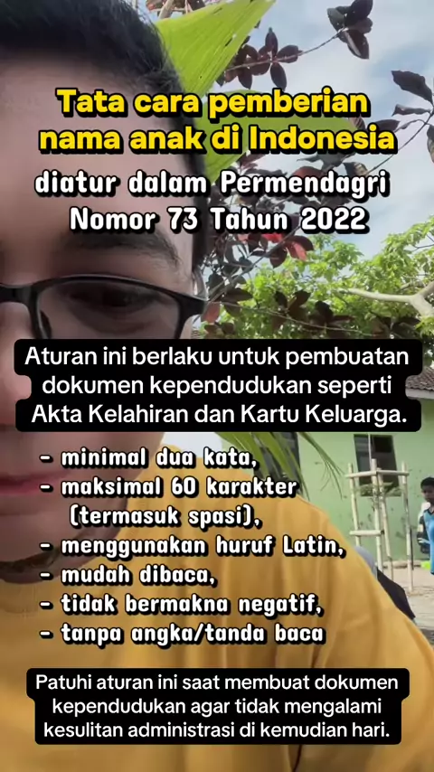 Berikut adalah poin-poin penting tata cara pemberian nama anak sesuai aturan pemerintah: Minimal Dua Kata: Nama anak tidak boleh hanya satu kata, melainkan minimal terdiri dari dua kata atau lebih. Maksimal 60 Karakter: Panjang nama, termasuk spasi, tidak boleh lebih dari 60 karakter. Huruf Latin & Bahasa Indonesia: Wajib menggunakan huruf alfabet latin (A-Z) sesuai kaidah bahasa Indonesia. Dilarang Tanda Baca & Angka: Nama tidak boleh mengandung angka atau simbol/tanda baca (contoh: koma, peti...