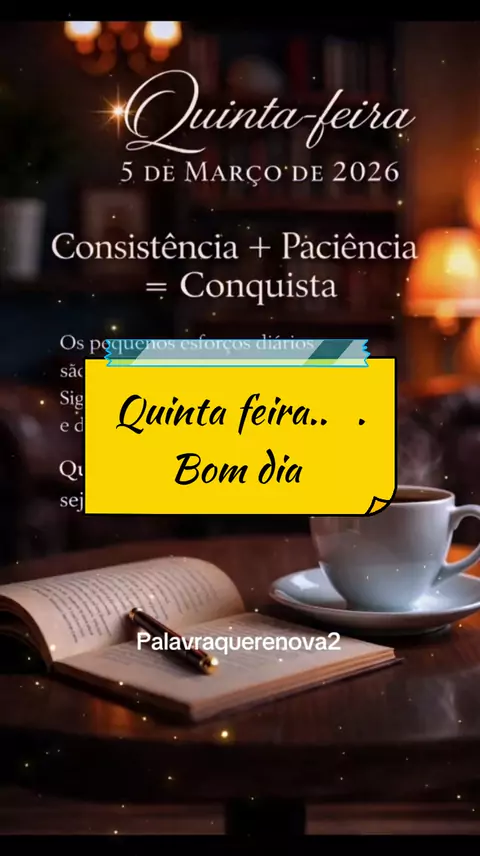 Quinta-feira de Persistência e Conquistas Quinta-feira, 5 de março de 2026 Hoje é mais um dia para seguir em frente com determinação. Grandes conquistas não acontecem de uma vez… elas são construídas com pequenos passos, disciplina e constância. Não desista por parecer difícil. Continue, mesmo que devagar. Cada esforço feito hoje está preparando as vitórias de amanhã. #BomDia #QuintaFeira #MotivaçãoDiária #Persistência #Foco