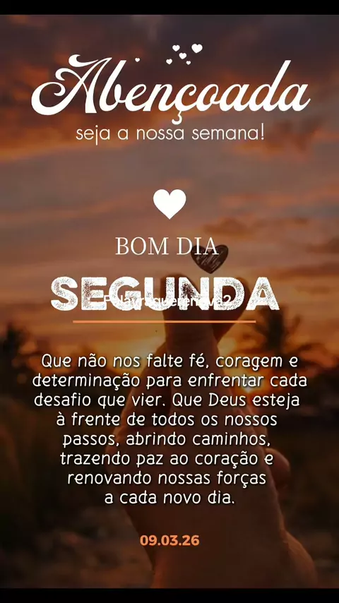 Bom dia, Segunda-feira Abençoada Segunda-feira, 9 de março de 2026 Abençoada seja a nossa semana! Que não nos falte fé, coragem e determinação para enfrentar cada desafio que vier. Que Deus esteja à frente de todos os nossos passos, abrindo caminhos, trazendo paz ao coração e renovando nossas forças a cada novo dia. Que esta segunda-feira comece com esperança e termine com gratidão. Deus está cuidando de tudo! 🙏✨ #bomdia #segundafeira #segundafeiraabençoada #deusnocomando #mensagemdefé