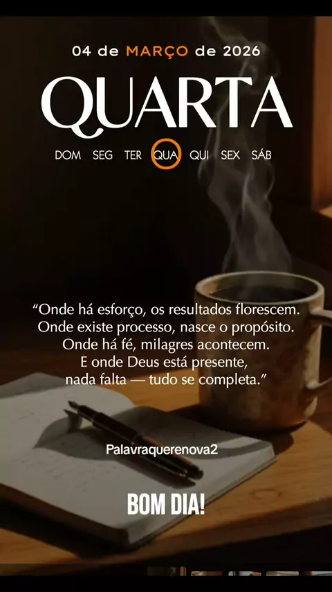 QUARTA-FEIRA DE FÉ ❤️ 📅 04 de Março de 2026 ✨ MOTIVAÇÃO DO DIA Onde há esforço, os resultados florescem. Onde existe processo, nasce o propósito. Onde há fé, milagres acontecem. E onde Deus está presente, nada falta — tudo se completa. Que hoje você caminhe com confiança, perseverança e o coração firmado em Deus. 🙏 #Quartafeira #MotivaçãoDoDia #FéQueMove #ConfieEmDeus #DeusNoControle