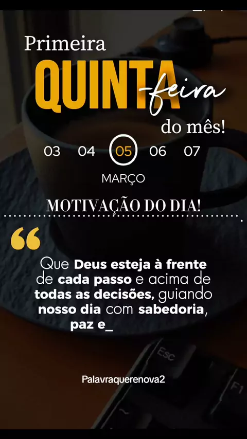 ✨ PRIMEIRA QUINTA-FEIRA DO MÊS 📅 Quinta-feira • 05 de Março de 2026 ☕ MOTIVAÇÃO DO DIA Que Deus esteja à frente de cada passo, acima de todas as decisões, e no controle de cada detalhe. Que hoje seja guiado por sabedoria, marcado pela paz e conduzido com propósito. 🙏 Entregue, confie e avance. #PrimeiraQuinta #MotivaçãoDoDia #Fé #DeusNoControle #Propósito