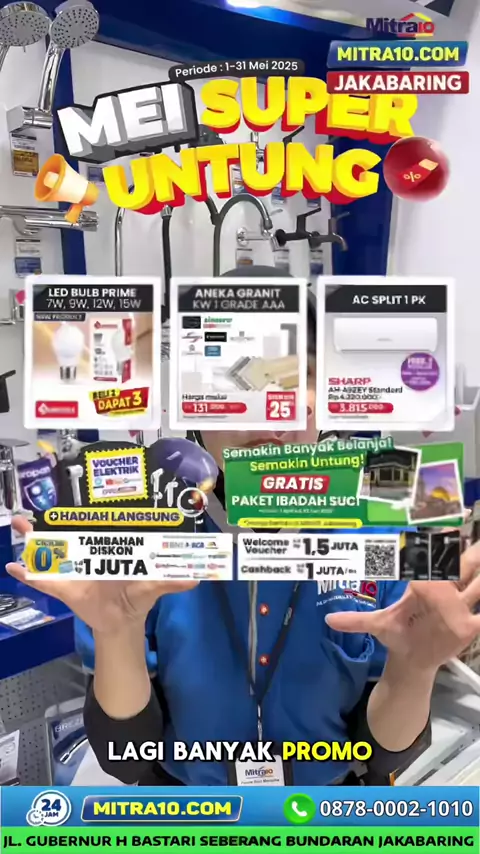 🔥 Warga Jakabaring, lagi renov rumah? Yuk borong kebutuhan rumahmu di Mitra10 Jakabaring, lagi ada MEI SUPER UNTUNG! 💸 ✨ Granit KW1 Diskon s.d 25% ✨ Beli 2 Dapat 3 LED Bulb ✨ AC 1 PK mulai 3,8jt Belanja bisa dapet hadiah langsung, voucher elektronik, bahkan kesempatan menang Paket Ibadah Suci 🕌 📍Lokasi strategis depan Bundaran Air Mancur di Jl. Gubernur H Bastari, 15 ulu, Kecamatan seberang Ulu 1, Kota Palembang Parkir luas, staf ramah, belanja makin puas! 📅 Promo cuma sampai 31 Mei 2025 ...
