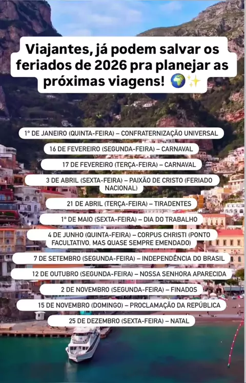 VIAJANTES, já podem SALVAR os FERIADOS de 2026 pra planejar as próximas VIAGENS!🌍✨🧡 - #dicasdeviagem #feriados #feriados2026 #feriadao #feriadaoparaviajar