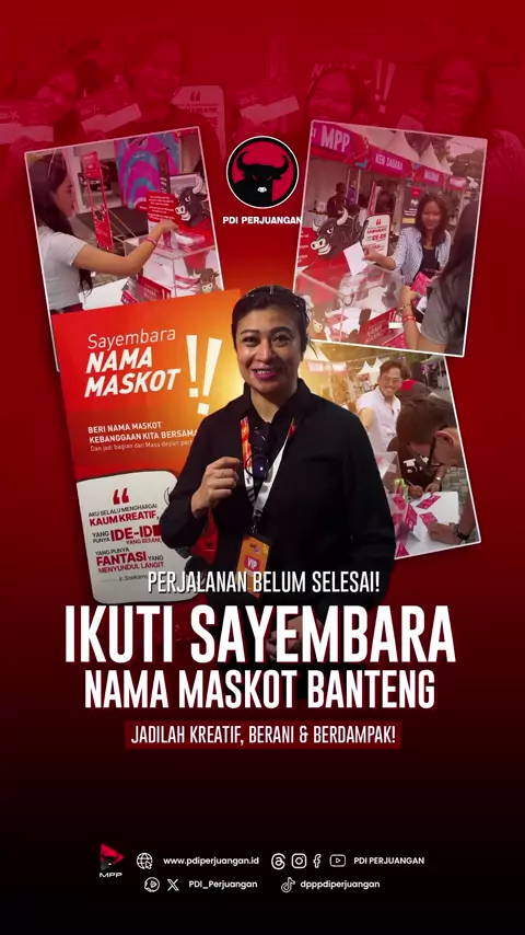 Dari Bali, Jakarta, Yogyakarta, hingga Bangka Belitung — semangat kreatif rakyat Indonesia terus menyala! Ikuti Sayembara Nama Maskot Banteng, bisa langsung di setiap kegiatan Partai di kotamu. Dapatkan merchandise eksklusif dari PDI Perjuangan Pemenang utama akan diumumkan di HUT Partai bulan Januari 2026! Sayembara berlangsung hingga 31 Desember 2025 Karena masa depan dibangun dari ide-ide berani! #PDIPKreatif #PDIPerjuangan #SayembaraNamaMaskotBanteng