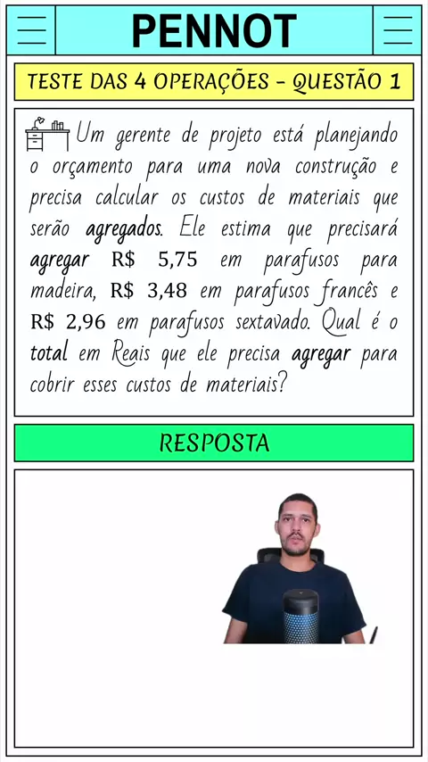 TESTE DAS 4 OPERAÇÕES | QUESTÃO 1 Um gerente de projeto está planejando o orçamento para uma nova construção e precisa calcular os custos de materiais que serão agregados. Ele estima que precisará agregar R$ 5,75 em parafusos para madeira, R$ 3,48 em parafusos francês e R$ 2,96 em parafusos sextavado. Qual é o total em Reais que ele precisa agregar para cobrir esses custos de materiais?