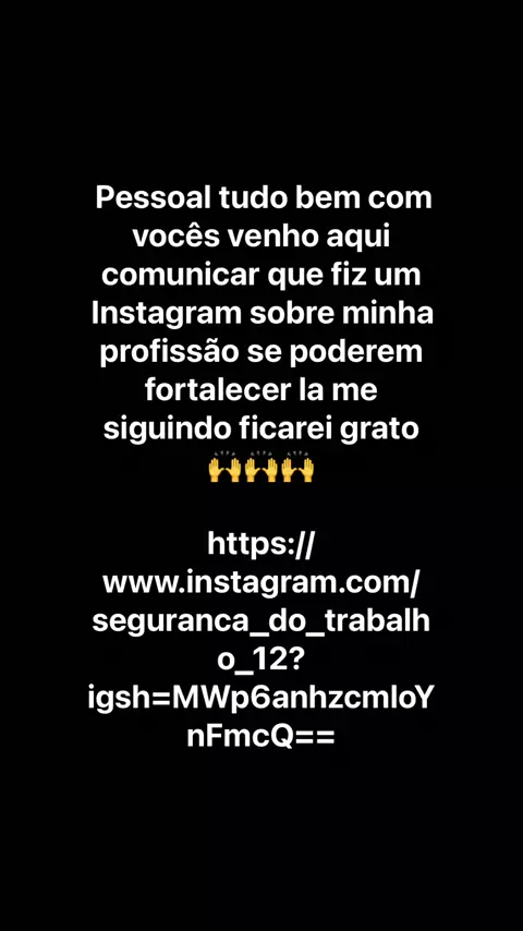 Por aqui encontrará de tudo um pouco mais tbm saberá um pouco sobre minha profissão Técnico de Segurança do Trabalho 😀 https://www.instagram.com/seguranca_do_trabalho_12?igsh=MWp6anhzcmloYnFmcQ== Me segue lá pessoal gratidão 🙏