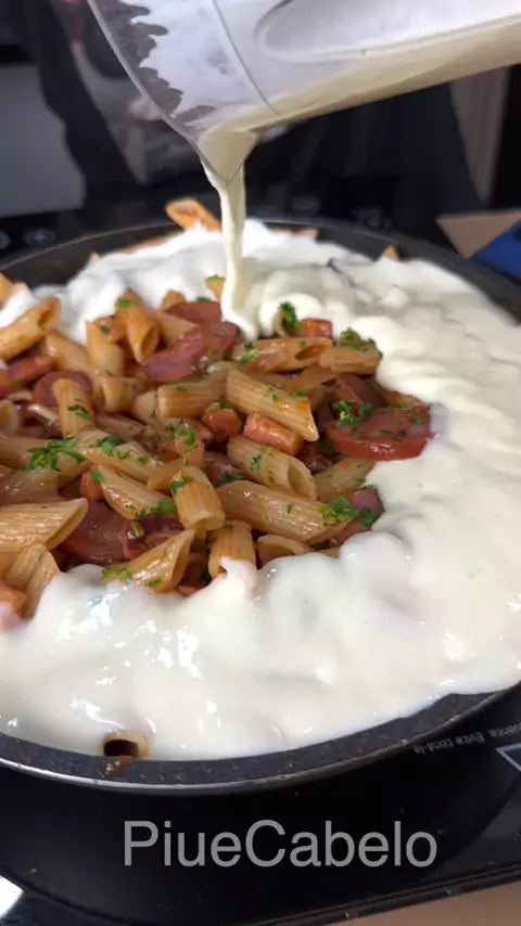 Macarrão turbinado em Uma panela só 🚀🔥 Em uma frigideira bem quente Frite o bacon, a calabresa e a cebola, na sequência coloque um sachê de molho de tomate e um pouco de água, finalize com um xáblau de páprica e Cheiro verde Pro molho branco: 1 caixa de creme de leite 2 batatas cozidas 1 xáblau de sal à agosto A batata serve pra engrossar o molho branco, caso fique mto líquido adicione mais batata, ou caso fique mto grosso coloque mais creme de leite ou leite 😉 Coloque o macarrão já coz