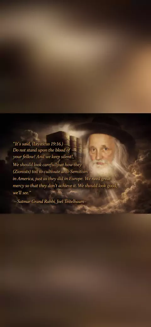 ☛ ❝The heartfelt cry and solemn warnings of the Grand Rabbi of Satmar Rabbi Joel Teitelbaum, were delivered at the General Assembly addressing Zionism in Parshat Naso 5721 (Sunday, June 4, 1961). "It's said, (Leviticus 19:16.) Do not stand upon the blood of your fellow! And we keep silent!, We should look carefully at how they (Zionists) toil to cultivate anti-Semitism in America, just as they did in Europe. We need great mercy so that they don't achieve it. We should look good, we’ll see."