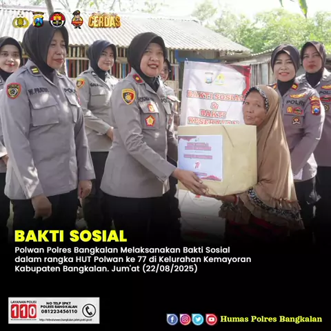 Polwan Polres Bangkalan Melaksanakan Bakti Sosial dalam rangka HUT Polwan ke-77 di Kelurahan Kemayoran Kabupaten Bangkalan. Jum'at (22/08/2025) @listyosigitprabowo @hendro_sukmono #polriuntukmasyarakat #polripresisi #humaspolri #humaspoldajatim #poldajatim poldajatim peduli