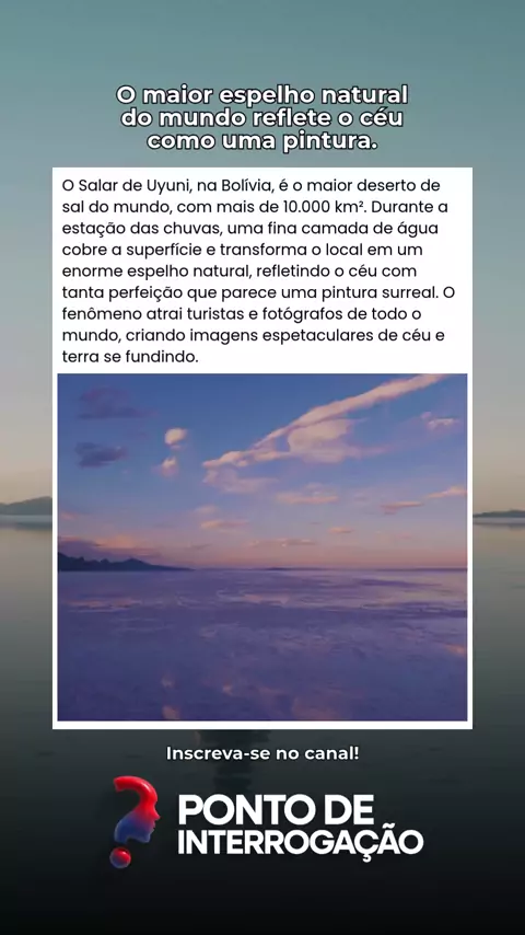 🌎 SALAR DE UYUNI: O ESPELHO NATURAL QUE ENGANA O CÉU E A TERRA! 1️⃣ O MAIOR ESPELHO DO PLANETA Durante a estação das chuvas (dezembro a março), o Salar de Uyuni (Bolívia) se transforma: Água rasa cobre 10.582 km² de sal, criando um reflexo perfeito do céu. Parece infinito: Horizonte e nuvens se fundem, apagando a linha entre chão e firmamento. 2️⃣ POR QUE A REFLEXÃO É TÃO PERFEITA? Superfície planíssima: Desnível de apenas 1 m em toda a extensão. Crosta de sal hexagonal: Fractais naturais queb
