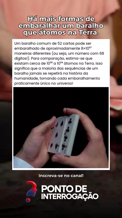 🃏 O BARALHO MAIS EMBARALHADO DO UNIVERSO! 1️⃣ UM NÚMERO QUE ESTRAGA SEU CÉREBRO Um baralho comum de 52 cartas pode ser embaralhado de: 8 × 10⁶⁷ combinações possíveis (ou 80.000.000.000.000.000.000.000.000.000.000.000.000.000.000.000.000.000.000.000.000.000.000). Átomos na Terra: "Apenas" ~10⁵⁰ – ou seja, cada embaralhamento único na história usaria menos de 1 átomo por combinação! 2️⃣ POR QUE É TÃO GRANDE? Fatorial de 52 (52!) = 52 × 51 × 50 × ... × 1. Se você embaralhar 1x por segundo desde o