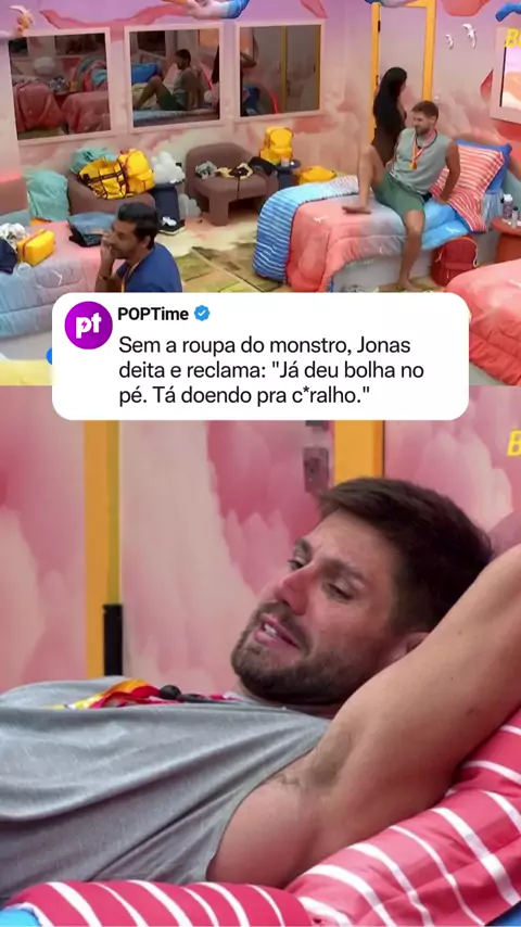 Sem a roupa do monstro, Jonas deita e reclama: "Já deu bolha no pé. Tá doendo pra c*ralho." 📸 Imagens: @tvglobo @bbb #redebbb #bbb26