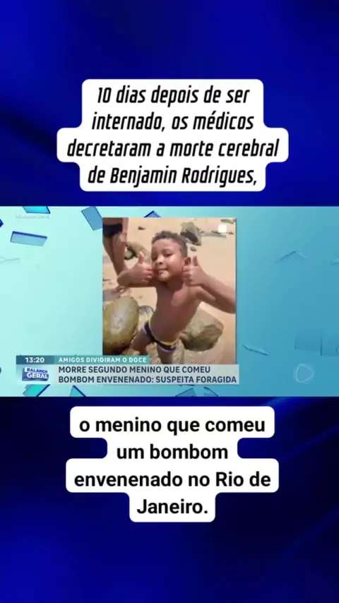 10 dias depois de ser internado, os médicos decretaram a morte cerebral de #BenjaminRodrigues, o menino que comeu um bombom envenenado no Rio de Janeiro. A criança ganhou metade do doce que ganhou do amigo, Italo, que também morreu. Testemunhas disseram que Ítalo ganhou o bombom de uma mulher em uma moto. #noticias #ultimasnoticias #urgente