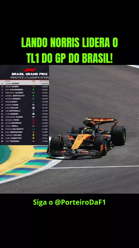 🏁 TL1 — GP do Brasil 🇧🇷 Lando Norris começa o fim de semana voando! 🚀 Lidera o primeiro treino livre em Interlagos! 🔥 E olha quem aparece em 5º: o brasileiro Gabriel Bortoleto mostrando que tem ritmo! 🇧🇷💪 #F1 #GPdoBrasil #Interlagos #LandoNorris #GabrielBortoleto