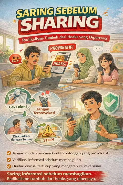 Saring sebelum sharing! Cek fakta, verifikasi informasi, dan diskusikan dulu sebelum berbagi. Radikalisme tumbuh dari hoaks yang dipercaya. #SaringSebelumSharing #CekFakta #LawanHoaks