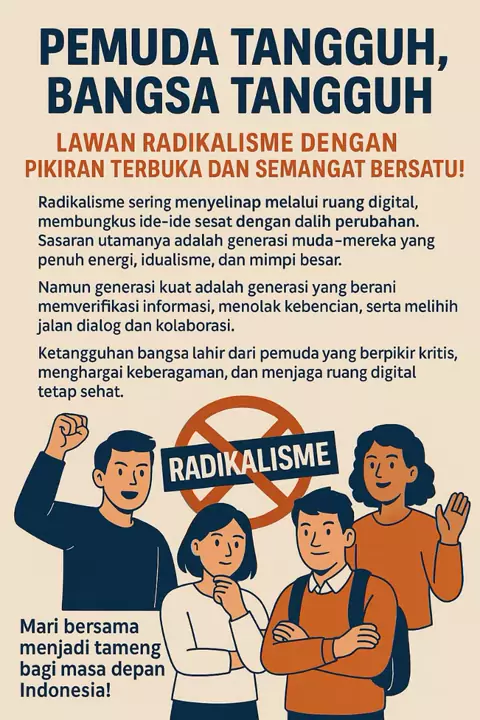 Pemuda tangguh, bangsa tangguh! Lawan radikalisme dengan pikiran terbuka dan semangat bersatu. Verifikasi informasi, tolak kebencian, pilih dialog dan kolaborasi! #PemudaTangguh #LawanRadikalisme #BangsaTangguh