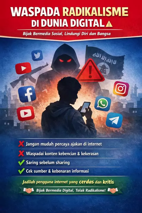 Waspada radikalisme di dunia digital, bijak bermedia sosial untuk lindungi diri dan bangsa dari konten kebencian! #WaspadaRadikalisme #BijakBermedsos #LindungiDiri #SaringSebelumSharing #TolakRadikalisme
