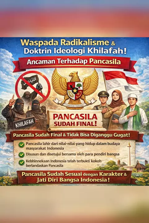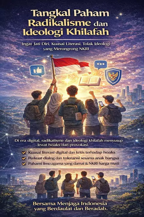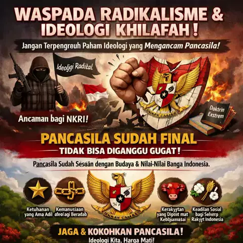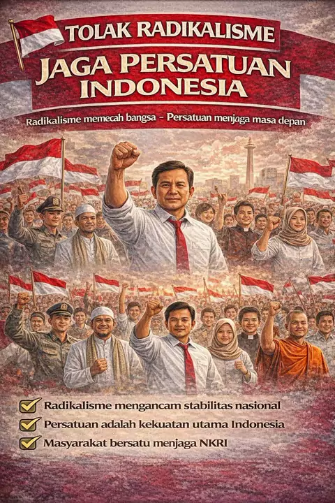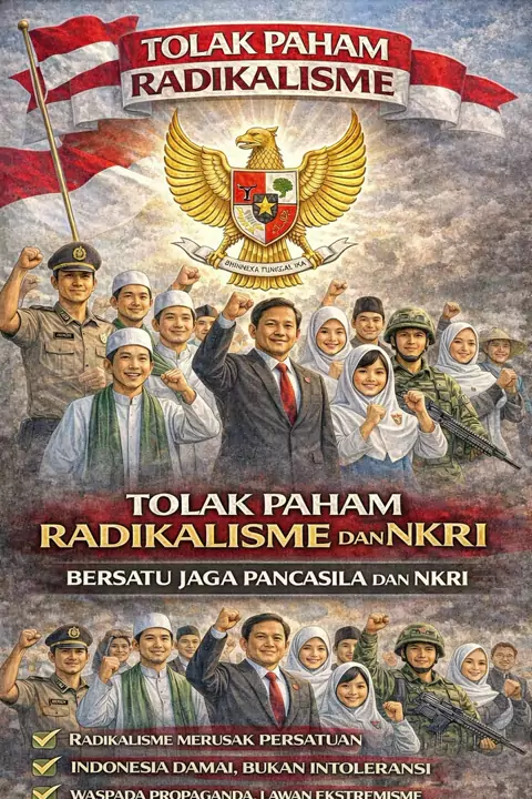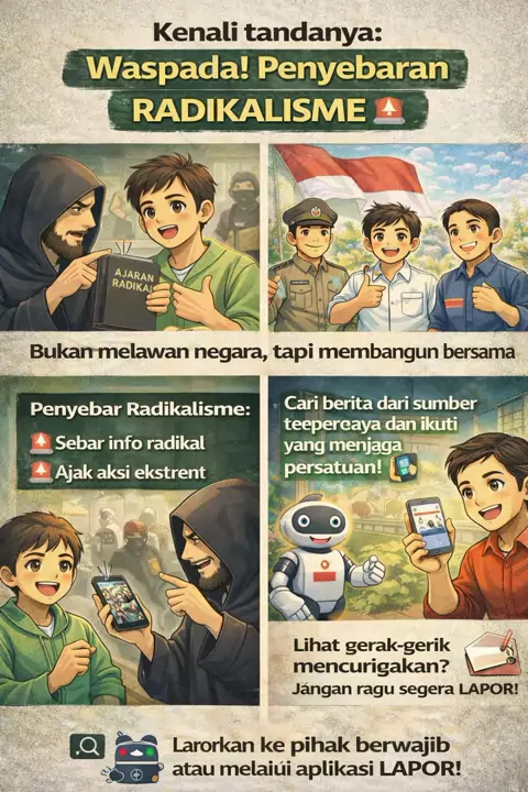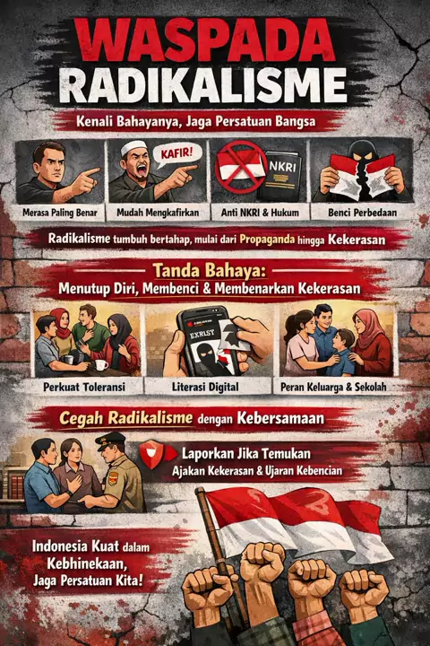 Waspada radikalisme! Jaga persatuan, rawat kebhinekaan. Radikalisme ancam nyata terhadap persatuan, keamanan, dan nilai kebangsaan. Sikap kritis terhadap informasi, tolak provokasi, dan perkuat persatuan serta toleransi. Tolak radikalisme, cintai perdamaian, jaga Indonesia! #WaspadaRadikalisme #JagaPersatuan #TolakRadikalisme