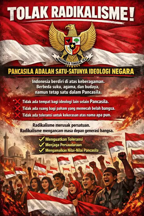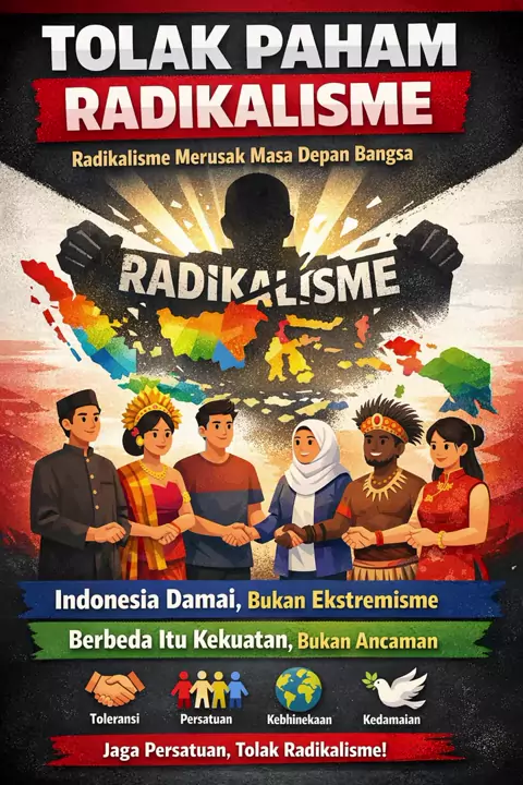 Tolak radikalisme! Jaga Indonesia tetap damai dengan menolak intoleransi, kekerasan, dan ajaran ekstrem yang merusak persatuan bangsa. #TolakRadikalisme #IndonesiaDamai