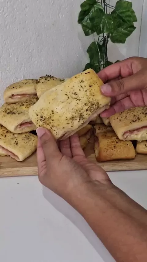 Como se chama esse salgado onde você mora? INGREDIENTES: 500 gramas de farinha de trigo 3 colheres de sopa de açúcar 10 gramas de fermento biológico seco 1/2 colher de sopa de sal 1 colher de sopa de margarina cheia 1 ovo pequeno 100 ml de água 150 ml de leite 200 gramas de queijo 200 gramas de presunto Forno a 180°C por 15 minutos ou até dourar #salgado #receita #ganhardinheiro #rendaextra
