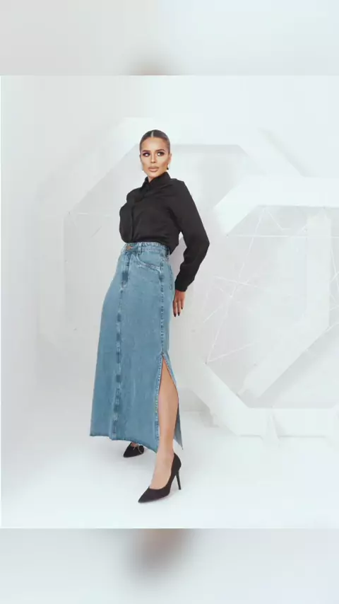 ✨ Estilo que combina com tudo! Saia midi jeans moderna, com fenda nas duas laterais, sem barra, simples, elegante e super versátil para looks casuais ou sofisticados. 💙👖 #saiamidi #jeans #modafashion