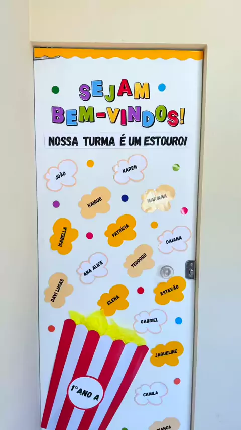 Painel de Porta Volta às Aulas - Pipoca 🍿 Comente EU QUERO para receber o link ✅ UM LINDO PAINEL DE PORTA PARA RECEPCIONAR A SUA TURMINHA. 💖 🍿No total você utilizará 14 folhas + a quantidade de alunos por pipocas (no arquivo contém 2 pipocas por folha A4). 🍿Você também receberá o LINK DO CANVA para editar as pipocas com os nomes dos alunos e a placa da turma. 🖨️ Arquivo em PDF Papel utilizado: Glossy fotográfico 180g O Pdf do material está custando apenas 8,00💲 . . #voltaasaulas #v