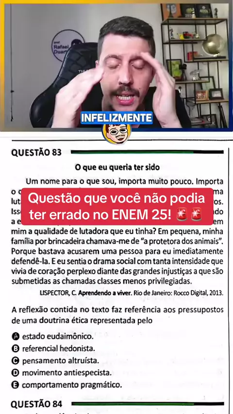 💡 Essa questão da Clarice Lispector (83) no ENEM 2025 foi uma daquelas que pareciam complexas — mas quem domina filosofia ética matou em segundos. O texto fala sobre o desejo de lutar pelo bem dos outros, movido por empatia e senso de justiça. 👉 Isso exclui qualquer ideia de prazer próprio (hedonismo) 👉 e se conecta diretamente ao pensamento altruísta, que é agir pelo outro. Muita gente confundiu com “estado eudaimônico”, mas cuidado: 🧠 Eudaimonia (pra Aristóteles) é a felicidade alcançada ...