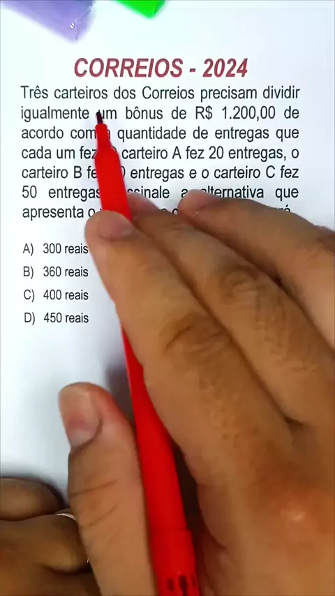 CORREÇÃO CORREIOS 2024 Matemática - Três carteiros dos Correios precisam dividir igualmente um bônus de R$ 1200,00 ... #correios #correios2024 #proporção #matematica