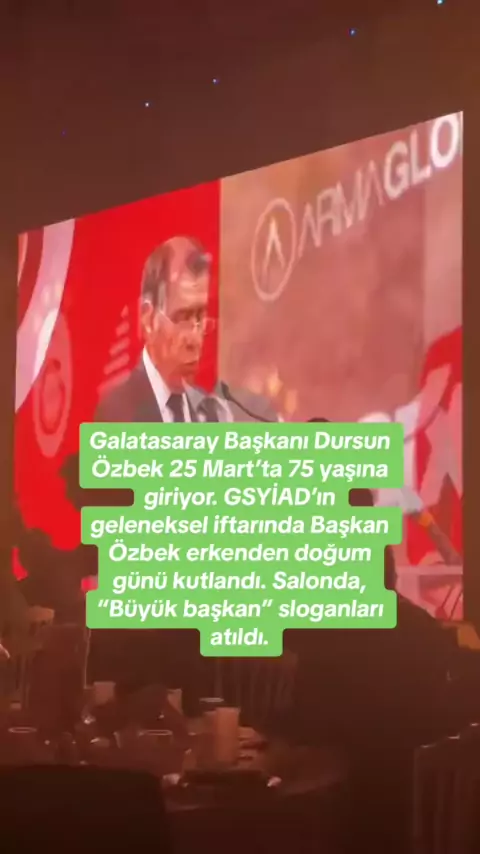 Galatasaray Başkanı Dursun Özbek 25 Mart’ta 75 yaşına giriyor. GSYİAD’ın geleneksel iftarında Başkan Özbek erkenden doğum günü kutlandı. Salonda, “Büyük başkan” sloganları atıldı.#galatasara#okanburuk#okanburuk💛❤#okanburuk❤️💛🙏#wilfriedzaha#mauroicardi🇦🇷#mauroicardi💛❤️#icardiii#icardigalatasarajyda#davinsonsánchez#sachaboey#boey#keremaktürkoğlu💛❤️#keremaktürkoglu#lucastorreira#musleram_1905#hakimziyech🇲🇦#ziyech🇲🇦#ndombele