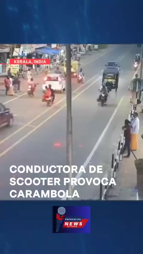 Uma motorista de scooter que virou inesperadamente à direita provocou um choque múltiplo entre seis carros, entre os quais a caravana que viajava o ministro-chefe de Kerala, Pinarayi Vijayan. Este incidente aconteceu em uma movimentada travessia do parque Vamanapuram, em Kerala, Índia, na última segunda-feira (28 de outubro). Nenhum ferido foi relatado. #choque #conductora #scooter #accidente #india