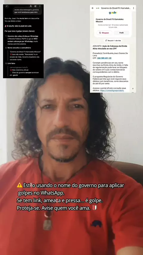 🚨 ALERTA DE GOLPE NO WHATSAPP Estão usando o nome do governo para enganar pessoas com mensagens falsas. Criam medo, urgência e ameaças para fazer você clicar no link. 📵 O governo NÃO cobra por WhatsApp. 🔗 Site oficial sempre termina em .gov.br. Link estranho = golpe. Compartilhe. Informação também protege. #AlertaDeGolpe #Golpe #Cuidado #UtilidadePública #SegurançaDigital