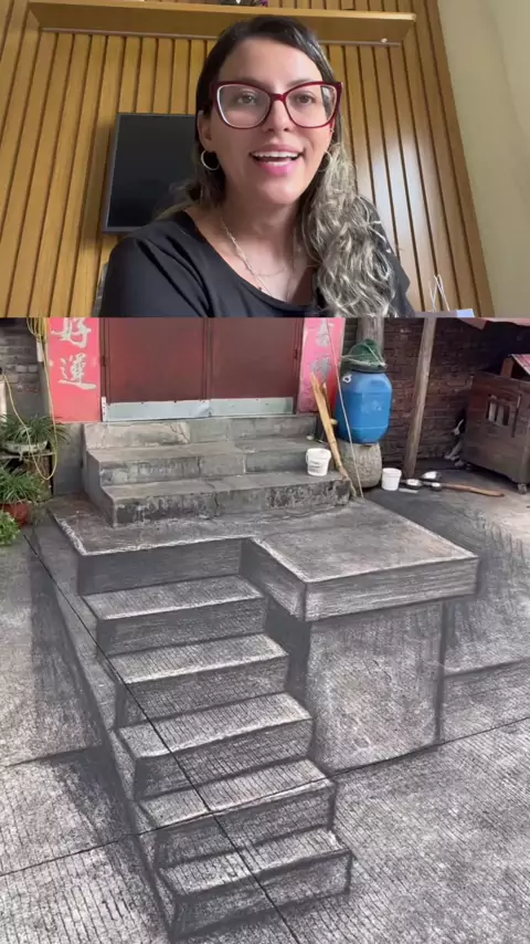 Pintura 3D impressionante 🎨 O casal abre a porta e dá de cara com essa escadaria que parece real. Dá até a sensação de que vão cair. Depois eles pulam, saltam, se divertem… no final, um balde de água e a arte acaba. O que você acha desse tipo de pintura? #selfcare #mentalhealth #healing #arte3d #arteurbana