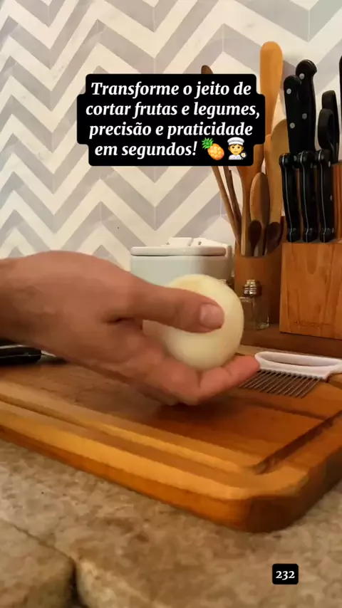 Corte frutas e legumes com precisão e segurança usando esse auxiliar em aço inoxidável. Ideal para facilitar sua rotina na cozinha! #cozinhapratica #achadinhos