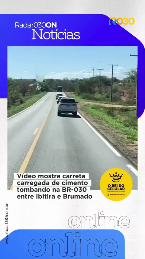Vídeo mostra carreta carregada de cimento tombando na BR-030 entre Ibitira e Brumado Imagens que circulam nas redes sociais mostram o momento em que uma carreta carregada de cimento tomba na BR-030, no trecho entre o distrito de Ibitira, em Rio do Antônio, e a cidade de Brumado. No vídeo, um homem acompanha o veículo e registra toda a cena com o celular. Ele narra que o motorista da carreta estaria realizando manobras perigosas, invadindo parcialmente a pista e conduzindo de forma instável. S...