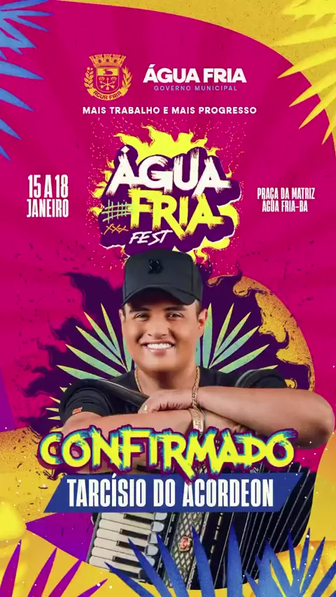 O forró que o Brasil ama vai tomar conta da Praça da Matriz! 💃🏽🕺🏽 Tarcísio do Acordeon está confirmado e vem pra fazer todo mundo cantar, dançar e se emocionar do começo ao fim! ❤️🔥 Prepare o par, aqueça o coração e venha viver noites inesquecíveis de muito forró e alegria! 📍 Praça da Matriz – Água Fria/BA 📅 15 a 18 de janeiro Isso é só o começo… vem muito mais por aí! 👀✨ #ÁguaFriaFest #Forró #TarcísioDoAcordeon #Confirmado #radiowebatividade