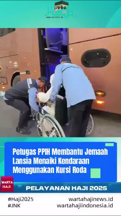 Petugas PPIH Membantu Jemaah Lansia Menaiki Kendaraan Menggunakan Kursi Roda #KemenagRI #Haji2025 #JNK #sorotan