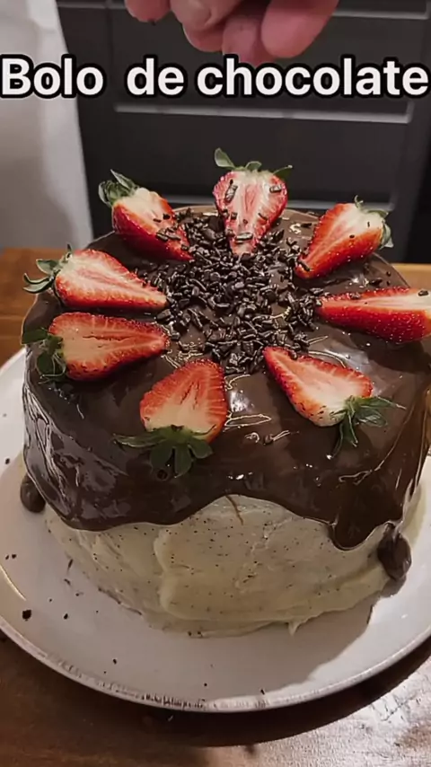 Bolo de Chocolate com Morangos e recheio de Ninho e cobertura de brigadeiro com morango #KwaiChef2025 #confeitaria #conquistar200k #GRATIDÃOAmigos #ReceitasDeliciosa