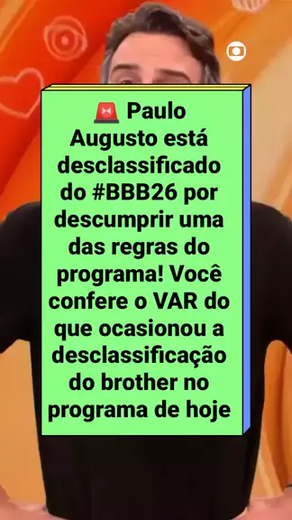 🚨 Paulo Augusto está desclassificado do #BBB26 por descumprir uma das regras do programa! Você confere o VAR do que ocasionou a desclassificação do brother no programa de hoje, depois de 'Três Graças'! #RedeBBB